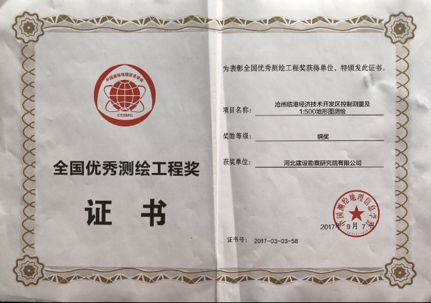 2017年9月7日,由我公司完成的滄州臨港經(jīng)濟技術(shù)開發(fā)區(qū)控制測量及1:500地形圖測繪項目,被中國測繪地理信息學會授予全國優(yōu)秀測繪工程銅獎。