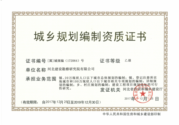 經(jīng)過艱苦努力,我公司于2017年12月25日取得了城鄉(xiāng)規(guī)劃編制乙級資質(zhì)證書,可承擔20萬現(xiàn)狀人口以下城市總體規(guī)劃的編制,登記注冊所在地城市和100萬現(xiàn)狀人口以下城市相關(guān)專項規(guī)劃的編制,以及建設(shè)工程項目規(guī)劃選址的可行性研究。