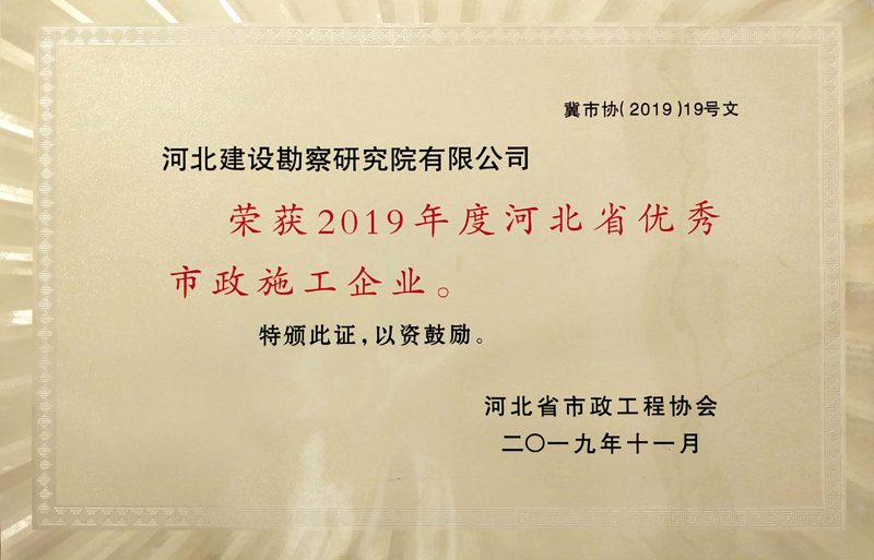 近日公司被河北省市政工程協(xié)會評為“2019年度河北省優(yōu)秀市政施工企業(yè)”;公司董事長韓立君同志獲評“2019年度河北省優(yōu)秀市政行業(yè)企業(yè)家”。