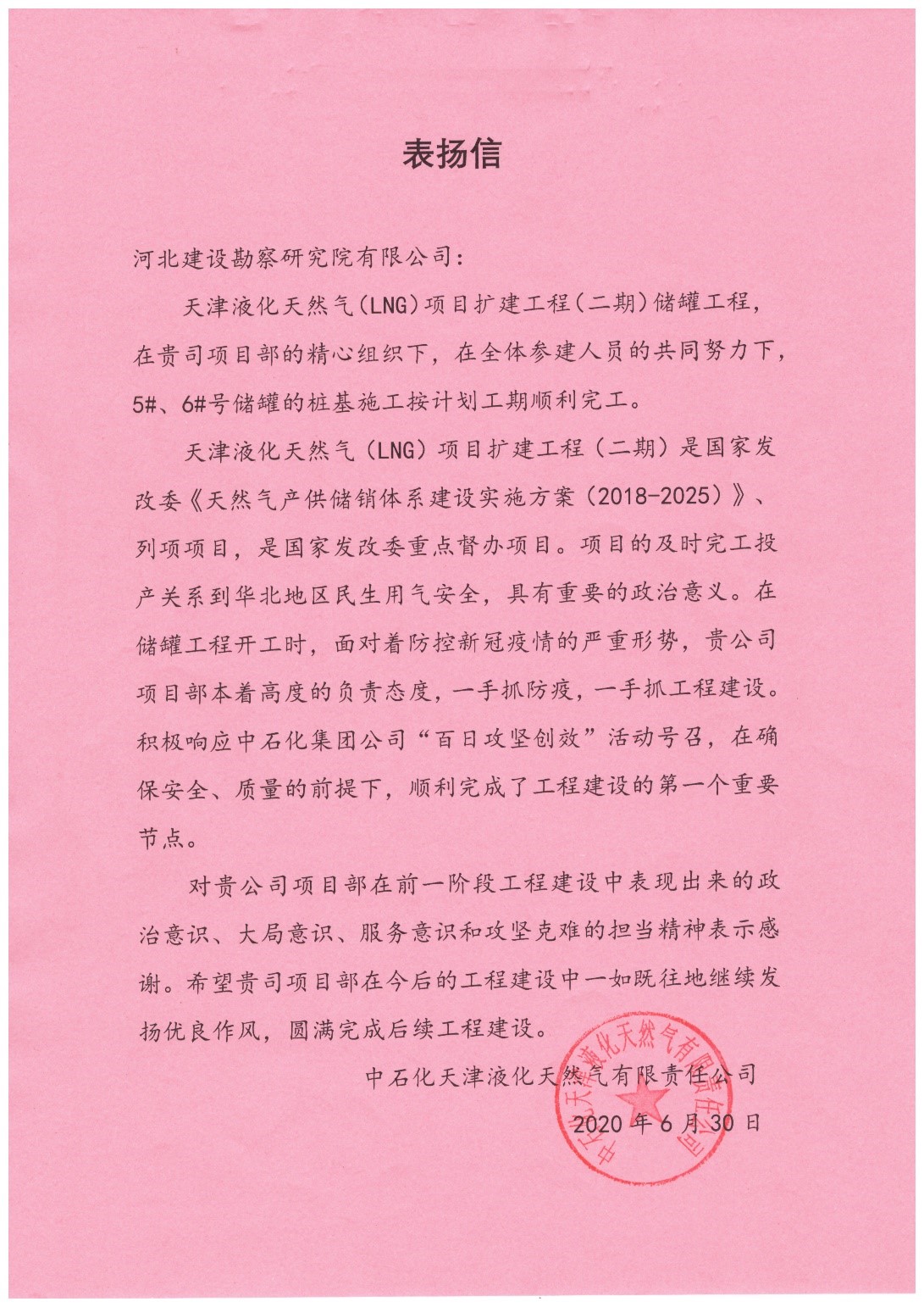 公司承建的天津液化天然氣(LNG)項(xiàng)目擴(kuò)建工程(二期)5#6#罐樁基工程,自2020年4月5日正式開(kāi)工,歷經(jīng)83個(gè)日夜的奮戰(zhàn),最終于2020年6月26日優(yōu)質(zhì)、高效、圓滿的完成了5#6#罐的樁基施工任務(wù)。中石化天津液化天然氣有限責(zé)任公司,對(duì)我公司中石化天津LNG二期項(xiàng)目部提出表?yè)P(yáng),表?yè)P(yáng)我公司領(lǐng)導(dǎo)及全體項(xiàng)目施工人員對(duì)項(xiàng)目高度負(fù)責(zé)的態(tài)度,一手抓防疫,一手抓工程建設(shè),積極響應(yīng)中石化集團(tuán)公司“百日攻堅(jiān)創(chuàng)效”活動(dòng)號(hào)召,在確保安全、質(zhì)量的前提下,順利完成了工程建設(shè)的第一個(gè)重要節(jié)點(diǎn)。同時(shí)對(duì)我公司在前一階段工程建設(shè)中表現(xiàn)出來(lái)的政治意識(shí)、大局意識(shí)、服務(wù)意識(shí)和攻堅(jiān)克難的擔(dān)當(dāng)精神表示感謝。希望我公司在今后的工程建設(shè)中一如既往地繼續(xù)發(fā)揚(yáng)優(yōu)良作風(fēng),圓滿完成后續(xù)工程建設(shè)。