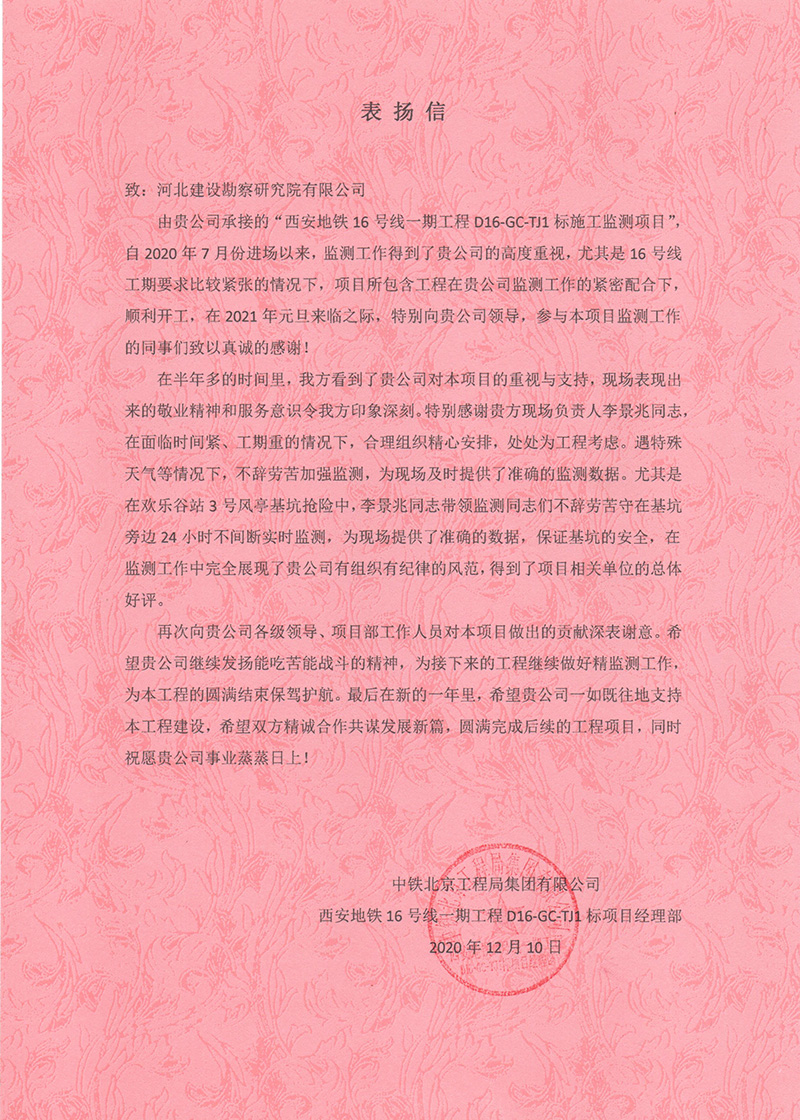 近日,公司收到中鐵北京工程局集團有限公司西安地鐵16號線一期工程D16-GC-TJ1標項目經理部的表揚信。