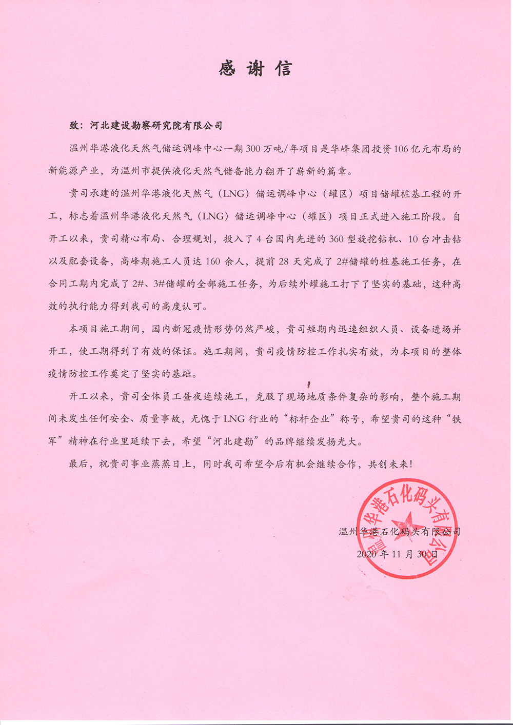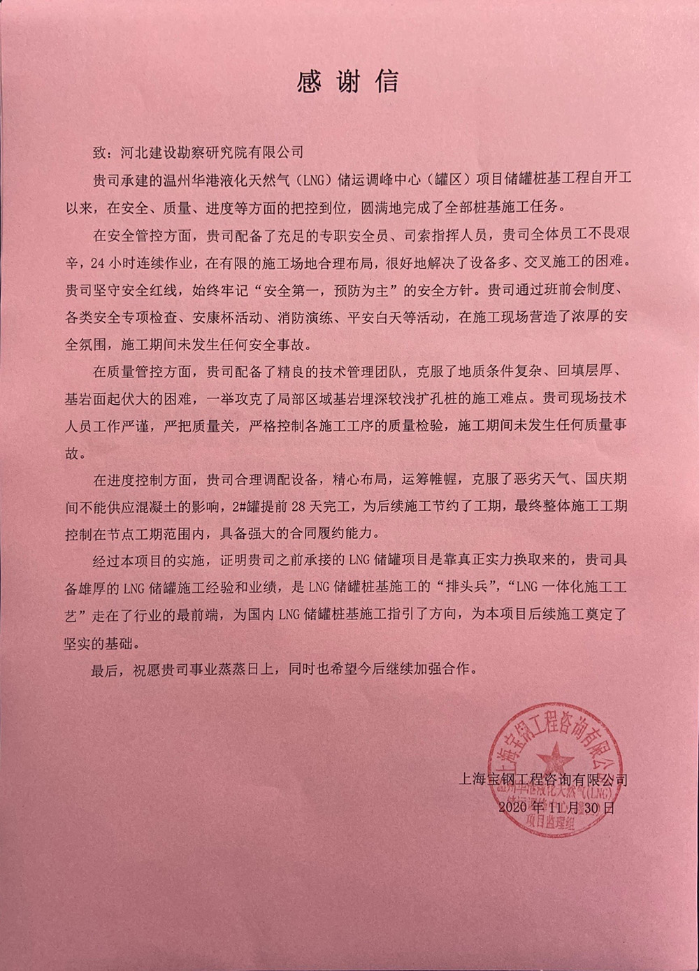 近日我公司溫州華港LNG項(xiàng)目部喜獲業(yè)主、總包、監(jiān)理的表揚(yáng)信,這是對(duì)項(xiàng)目部全體參建人員不畏艱難、頑強(qiáng)拼搏、攻堅(jiān)克難的施工精神的認(rèn)可和贊揚(yáng),更是對(duì)河北建勘高度的肯定。
