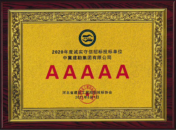 近日,公司被河北省建設工程招標投標協會評為2020年度河北省建設工程招標投標誠實守信5A級施工企業。