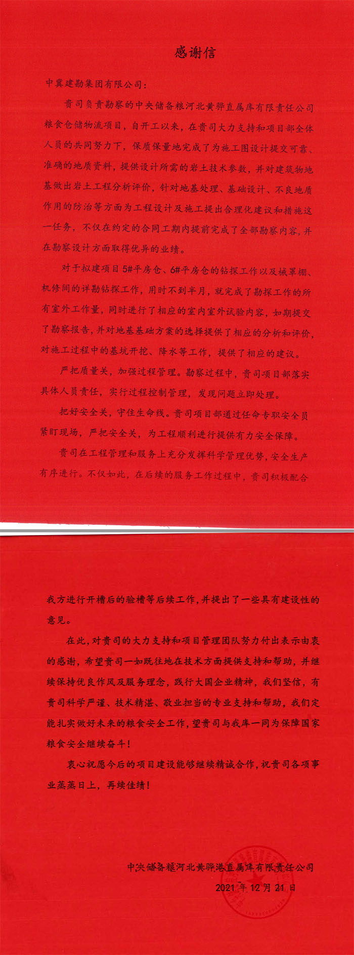 天津鐵廠有限公司煉鐵廠對我公司在疫情期間為確保項目目標迎難而上、攻堅克難的精神表示贊賞,對我公司一如既往的支持和客戶至上的理念表示感謝。中儲糧河北黃驊直屬庫有限公司對我公司的勘察報告、后續驗收服務表示贊許,對公司提供的科學嚴謹、技術精湛、敬業擔當的專業支持和幫助表示感謝。