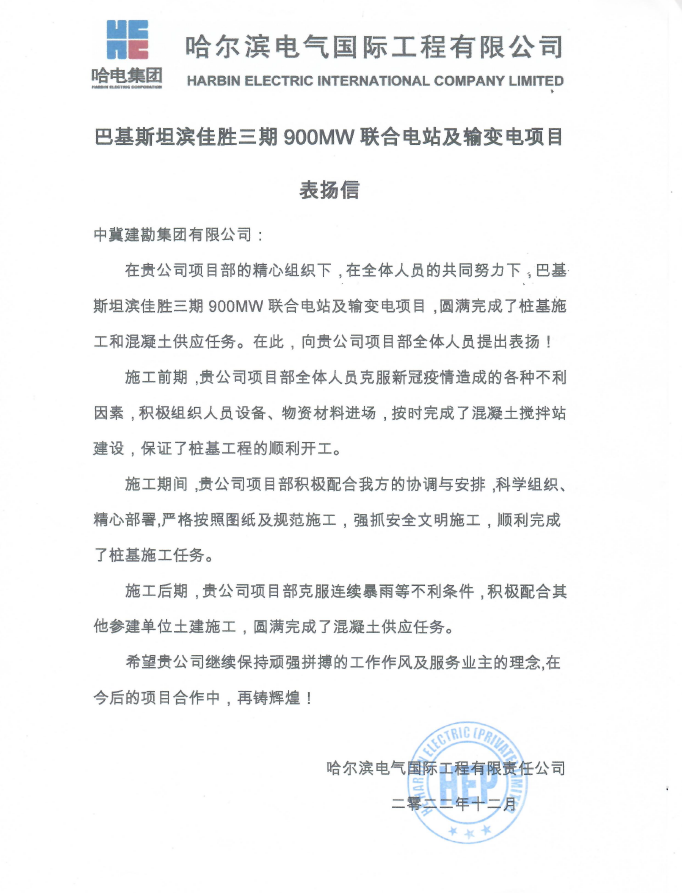 巴基斯坦濱佳勝三期900MW聯合電站及輸變電項目,圓滿完成了樁基施工和混凝土供應任務。施工期間,項目部員工積極配合業主的協調與安排,科學組織、精心部署,嚴格按照圖紙及規范施工,在克服連續暴雨等不利條件,搶抓安全文明施工,確保圓滿完成施工任務。我們頑強拼搏的工作作風及服務業主的理念得到了業主的高度認可。