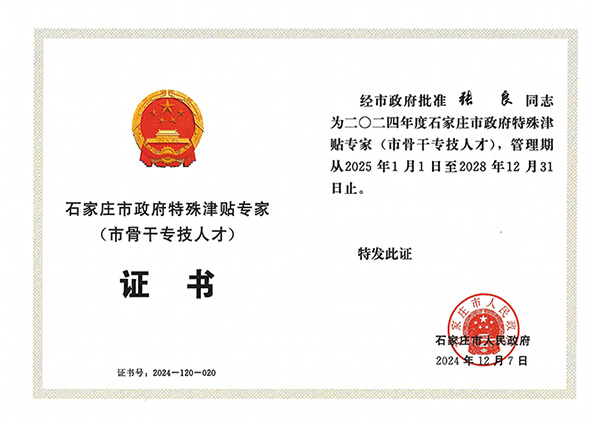 經公司組織申報,石家莊市鹿泉區人民政府推薦、石家莊市人力資源和社會保障局組織評審,石家莊市人民政府批準,我公司張良同志榮獲石家莊市政府特殊津貼專家(市骨干專技人才)稱號。